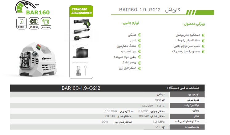 حد اقل فشار : 110BAR/حداکثرفشار: 160BAR/نوعموتور : دینامی/ ولت(فرکانس): AC240_220V50HZ/قدرت موتور : 1900W
